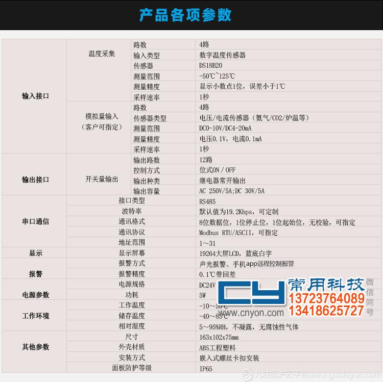 3. 4路溫度采集,可采集4個點的溫度,4路模擬量輸入(DC0-10V/DC4-20mA輸入),可設(shè)置模擬映射參數(shù)給客戶測量指定的爐溫(高溫)、濕度、氨氣、CO2等其他環(huán)境參數(shù)。